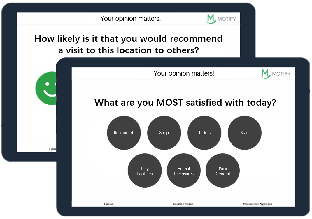 The Motify Experience Monitor is an unmanned on-site survey column that continuously collects the most honest and pure responses from your customers. Not a random indication once a year, but all year round. Adjustments are quickly visible and you can quickly adjust where necessary. Clear questions, personal input and opportunities to gain in-depth knowledge. Get to know everything, okay almost everything, about your customers. And make sure they look back on their last visit with an even more positive feeling every time. Sounds great, right?